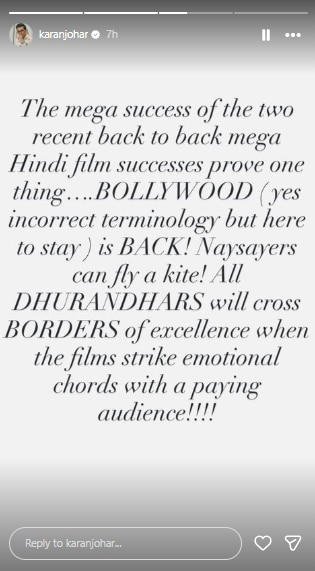 “The mega success of two back-to-back Hindi blockbusters proves one thing… Bollywood is back. Naysayers can fly a kite. All Dhurandhars will cross borders of excellence when films connect emotionally with paying audiences.”