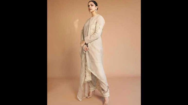 This ivory ethnic ensemble showcased Deepika’s love for quiet luxury. Featuring floral and geometric embroidery, the straight-cut kurta was paired with matching pants and a sheer dupatta. Sleek hair, statement earrings, and soft makeup completed the look with understated grace.
