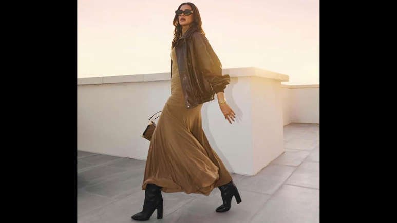 Deepika’s off-duty style came alive in a fluid brown midi dress, paired with black heeled boots and oversized sunglasses. The earthy palette and relaxed silhouette embodied the quiet luxury trend, making it perfect for travel or city strolls.