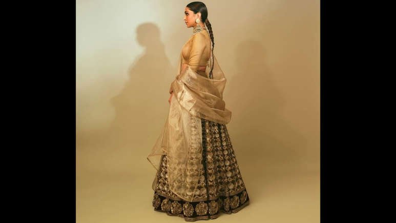 Deepika embraced Indian couture in a black lehenga adorned with antique gold embroidery. Paired with a fitted gold blouse and sheer dupatta, the look was completed with traditional jewellery and a sleek braided hairstyle — a perfect blend of heritage and refinement.