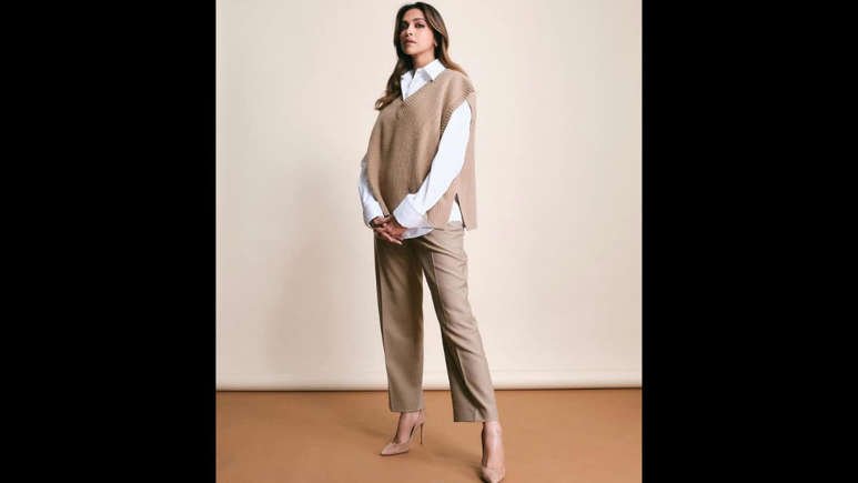 Deepika’s beige co-ord set — a white shirt under a knit vest with tailored trousers — redefined modern power dressing. Nude heels, soft waves, and natural makeup made this monochrome look a statement in minimalism.