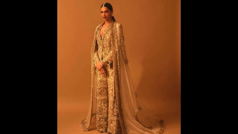 In a heavily embroidered gold gown, Deepika looked like red-carpet royalty. The deep neckline and structured silhouette were enhanced by a sheer embellished cape. Her centre-parted hair and celestial forehead accessory added a fairytale finish.