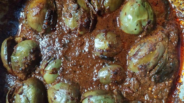 Whole brinjals stuffed with a peanut-sesame-coconut masala, slow-cooked for a rich, nutty, and tangy Andhra delicacy.