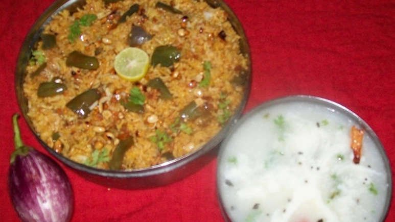 Karnataka’s fragrant rice dish where brinjal is cooked with tamarind and a special spice mix, popular in temples and lunchboxes.