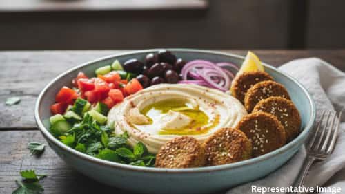 A wholesome mix of hummus, falafel, fresh veggies, and pita bread, offering refreshing Mediterranean flavours perfect for a nutritious meal.