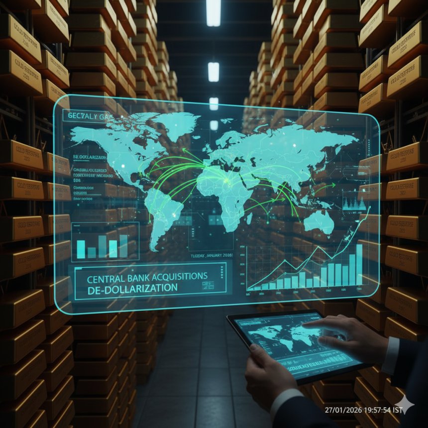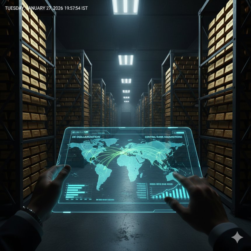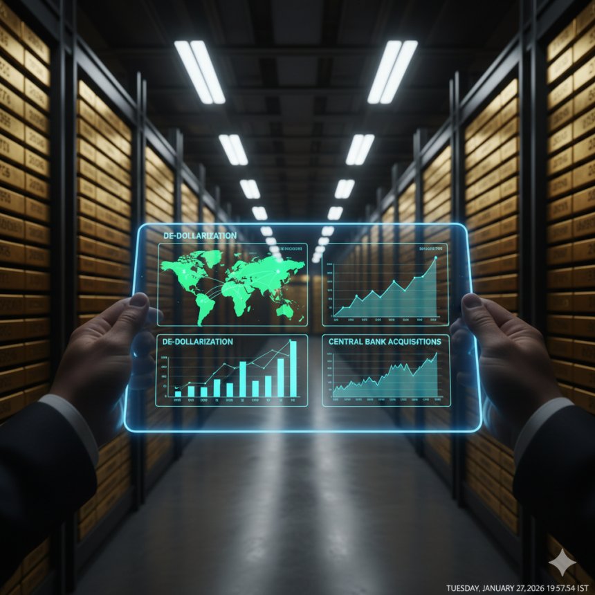 Image Suggestion: A stylized infographic showing a map of the world with arrows pointing from various countries to a central gold bar icon, overlaid on racks of gold bars in a vault. Data points on the screen show "Central Bank Acquisitions" and "De-dollarization."