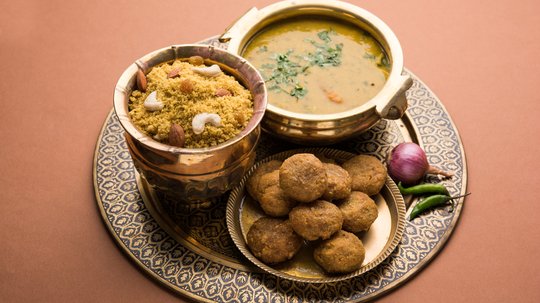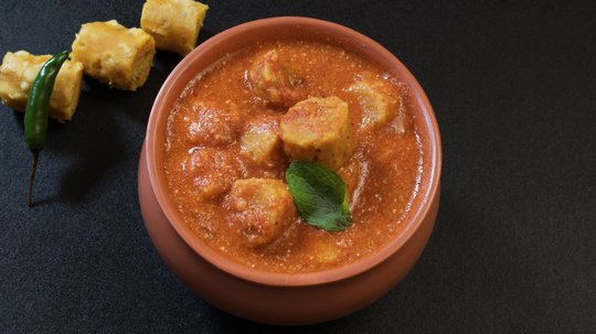 Gram flour dumplings simmered in a tangy yogurtābased gravy. Creamy, spicy, and slightly sour, this vegetarian dish showcases Rajasthani creativity with simple staples.