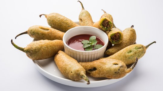 Large green chillies filled with spiced potato, dipped in batter, and fried crisp. A dramatic snack that pairs perfectly with hot chai.