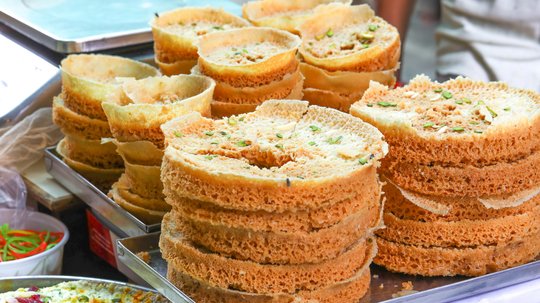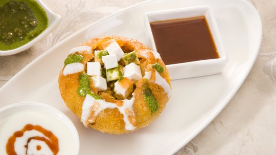 The king of chaat ā a giant puri stuffed with potatoes, chickpeas, yogurt, chutneys, and sev. A burst of creamy, tangy, and spicy flavors in every bite.