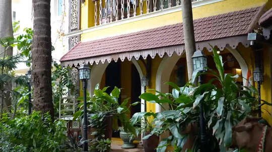 Backyard showcases laterite stone walls, colorful shutters, and even a resident cow named Kamdhenu.